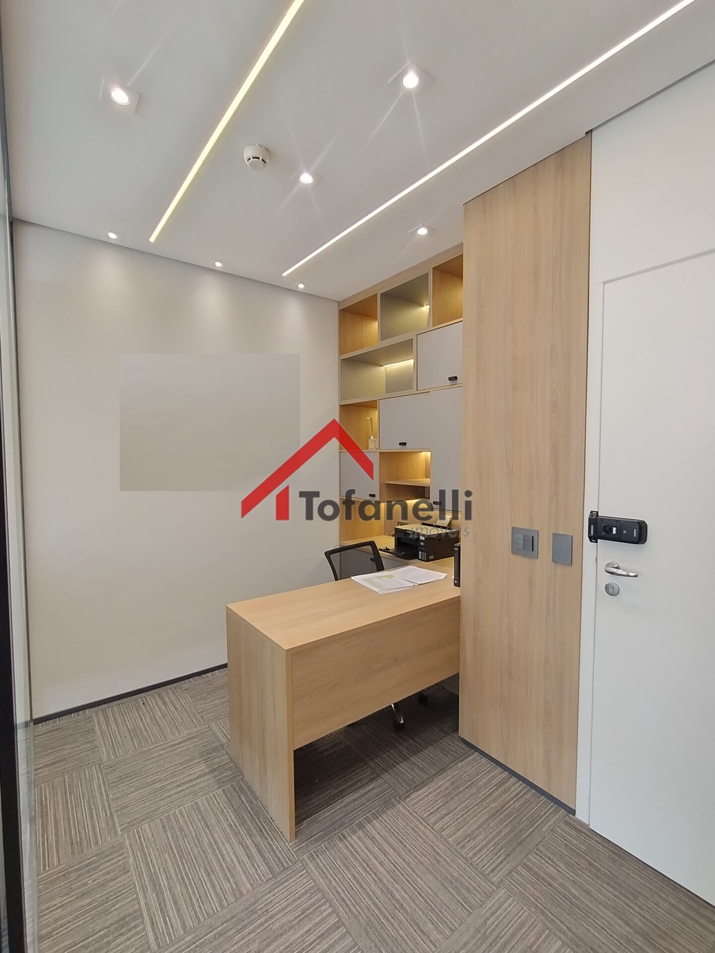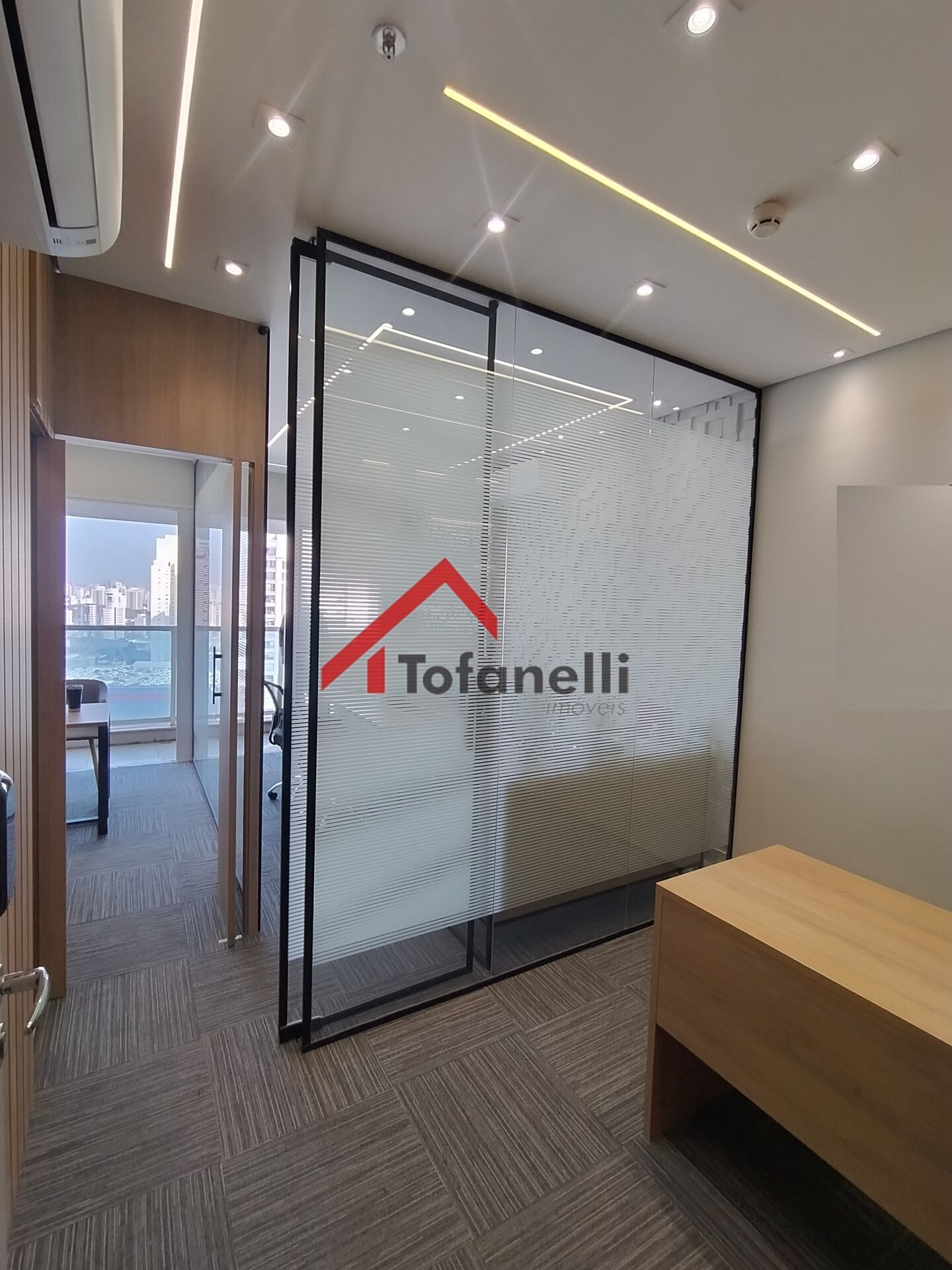 sala comercial 38m², mobilia, móveis planejados, divisórias em vidro, copa, banheiro privativo, ar condicionado, sacada e 1 vaga.